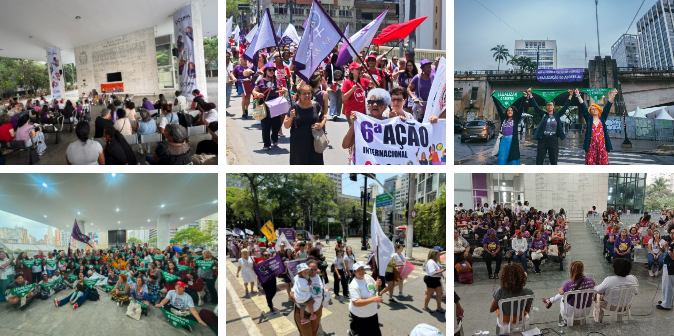 No Brasil a 6ª Ação se conectou com importantes processos de mobilização nacional: o Plebiscito Popular, contra a escala de trabalho 6×1 e taxação das grandes fortunas, a realização da 5ª Conferência Nacional de Políticas para as Mulheres, a 2ª Marcha Nacional das Mulheres Negras e Cúpula dos Povos na COP 30 de Belém que serão realizadas em novembro. Também seguimos de forma permanente nossa solidariedade feminista internacional às mulheres e povo Palestino, pelo fim do genocídio, já!
