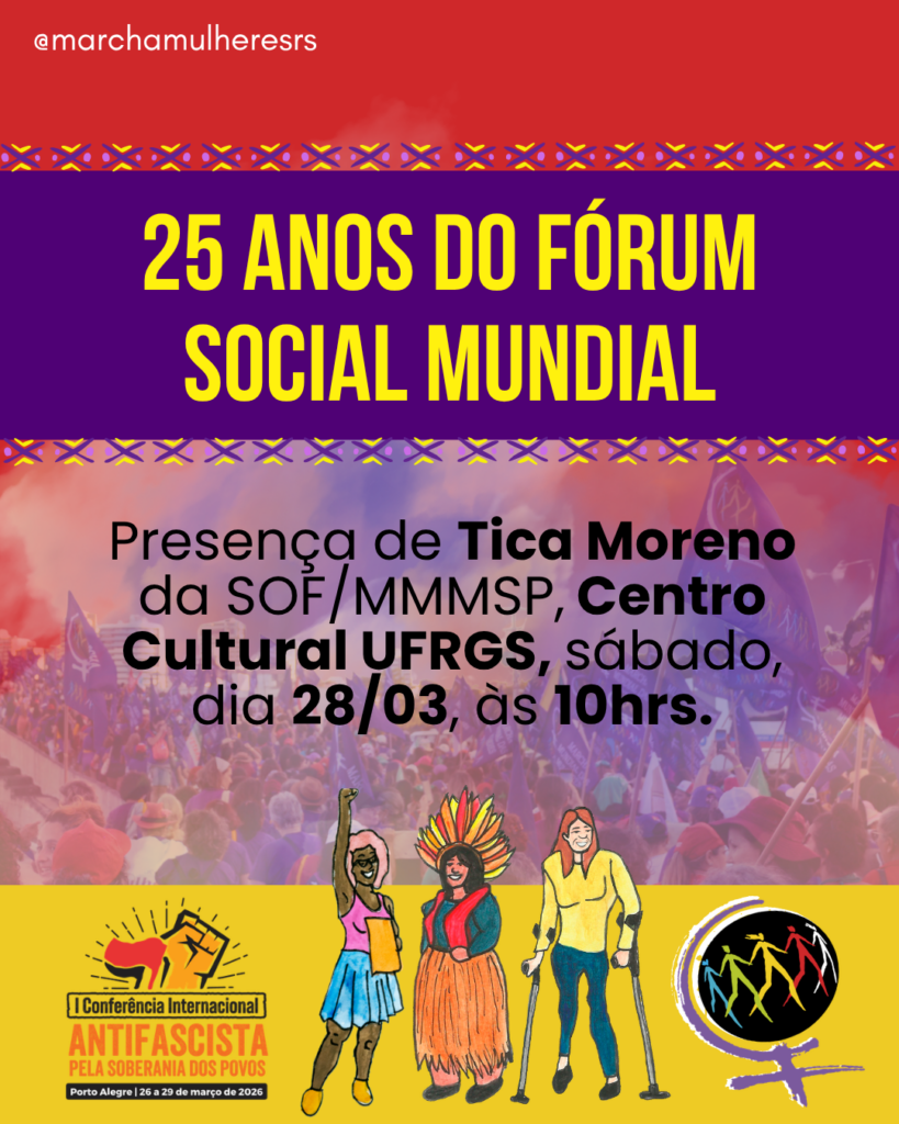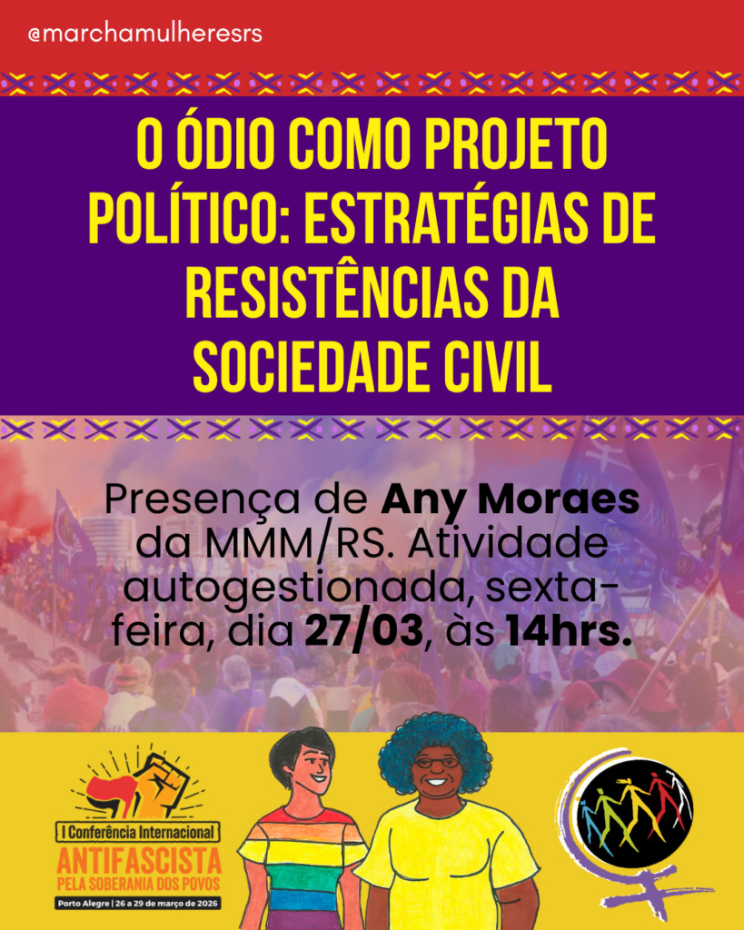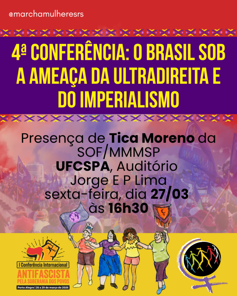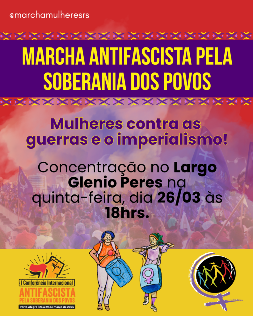 Nós, da Marcha Mundial das Mulheres (MMM), celebramos a luta dos povos contra o fascismo e o imperialismo pelo Brasil e no mundo. Participamos da organização da 1ª Conferência Internacional Antifascista em Porto Alegre porque vivemos um contexto internacional de ofensiva imperialista que tem como estratégia a submissão política e econômica dos povos do Sul global, condição para o capitalismo racista, heteronormativo e patriarcal.